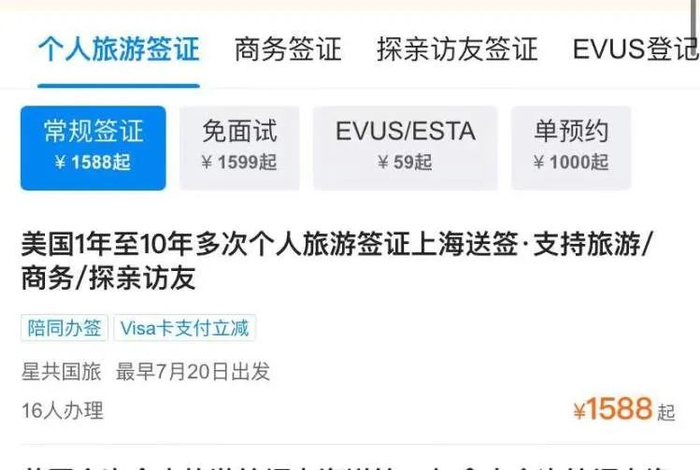 携程方面同样告知,上海美签的面签排到了7月末,记者在平台上查询发现,代办签证的费用在1600元左右,显示预计出行日期为7月21日。