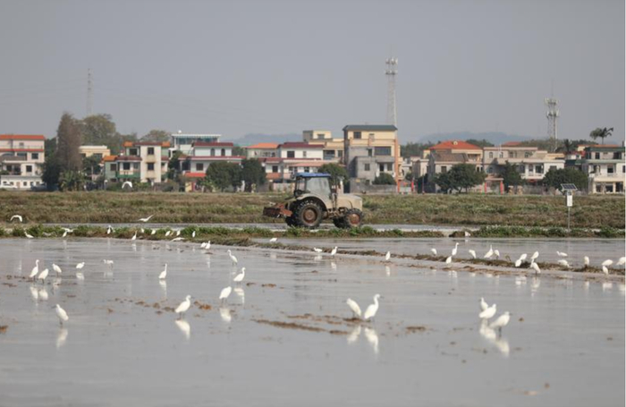 2月15日,阳光灿烂,正值春耕备耕时节,南朗街道崖口村积极开展农业生产。一群白鹭在犁田机周围觅食,组成了一幅灵动的春天画卷。