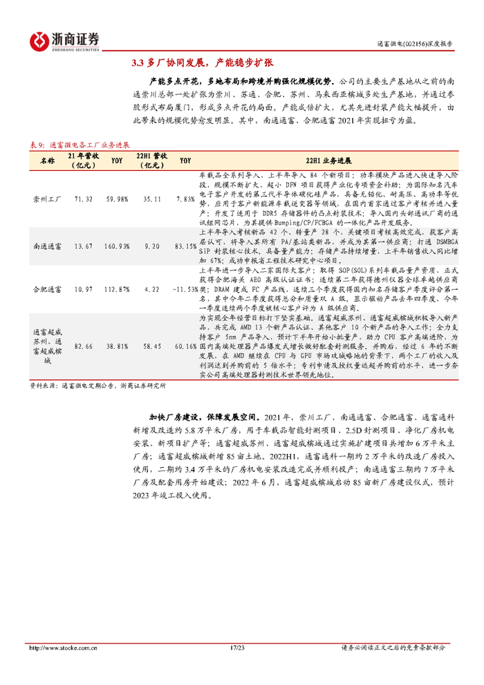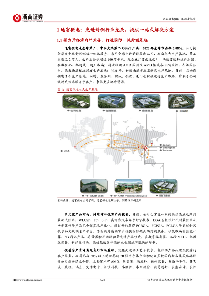 收购 AMD 苏州及 AMD 槟城各 85%股权,充分利用其 CPU、GPU 量产封测平 台,深度参与国产半导体高端芯片产业化过程。公司是 AMD 最大的封测供应商,占其订单总数 80%以上。已建成国内顶级 2.5D/3D 封装平台(VISionS)及 超大尺寸 FCBGA 研发平台,可为客户提供晶圆级和基板级 Chiplet 封测解决方 案;多层堆 NAND Flash 及 LPDDR 封装实现稳定量产。在南通、合肥、苏州、 槟城、厦门等多地布局,产能持续扩张。2022H1,通富通科一、二期改造完成 顺利投入使用;南通通富三期开始建设;通富超威槟城 85 亩新厂房启动建设。