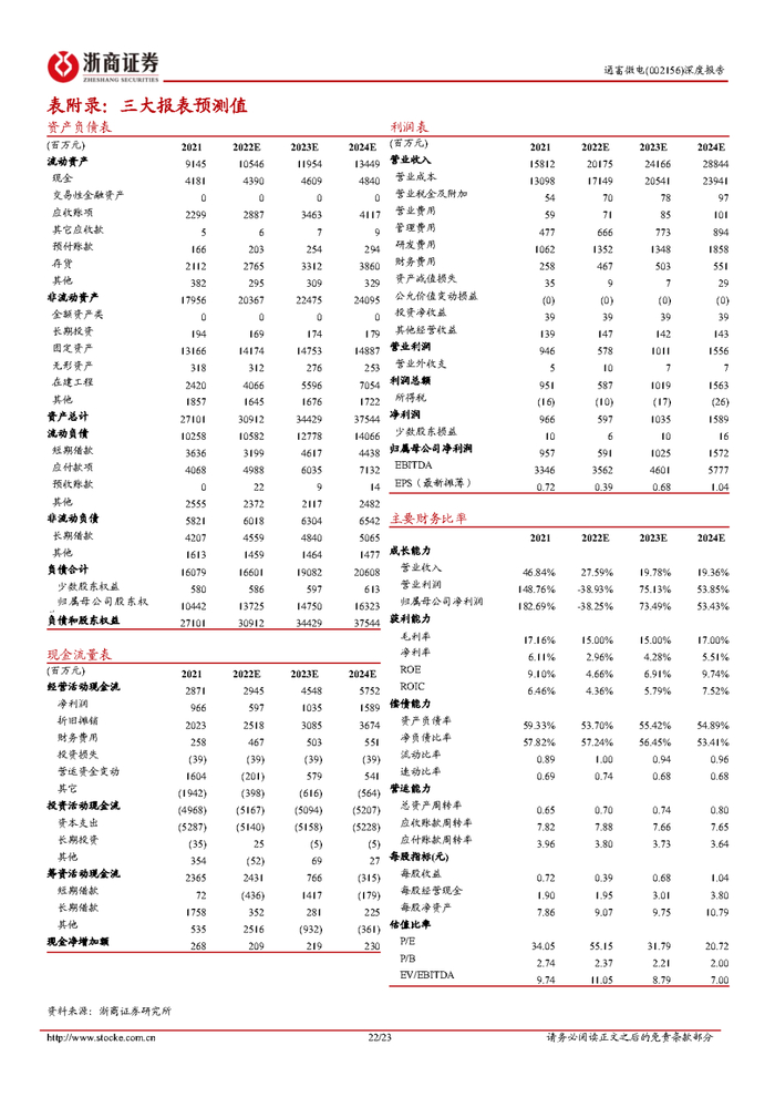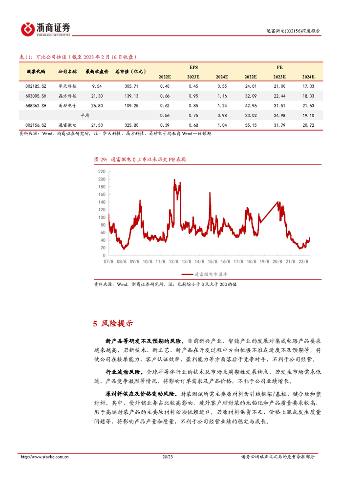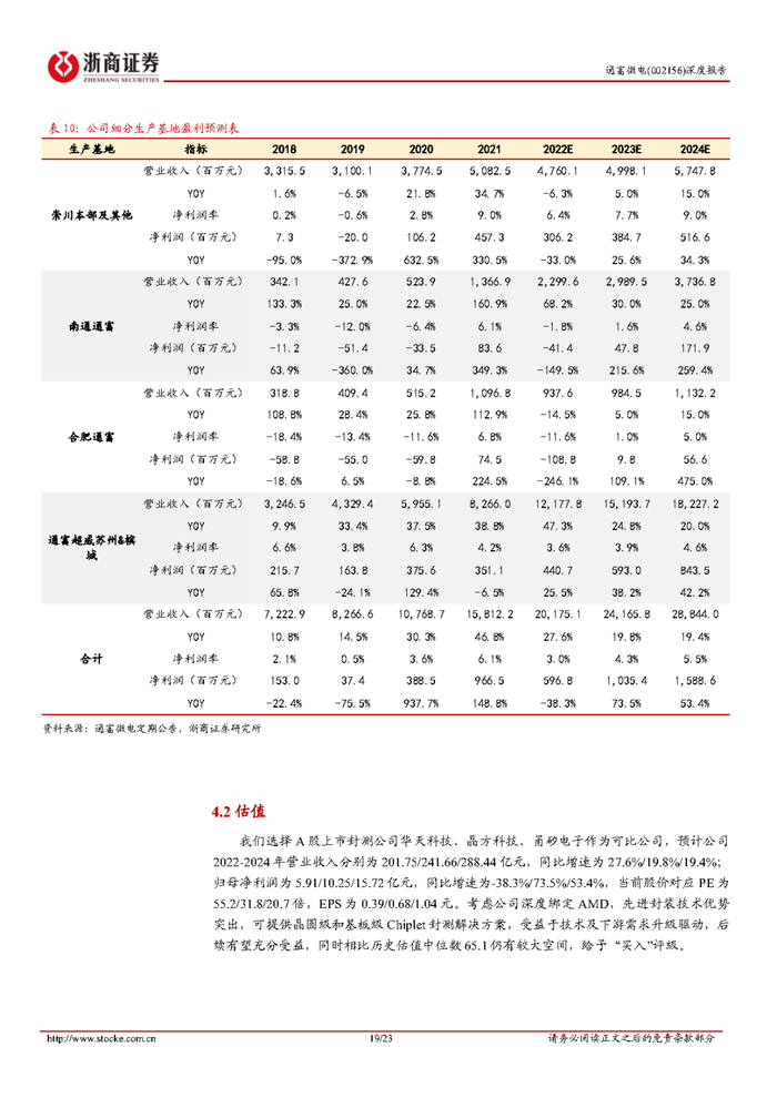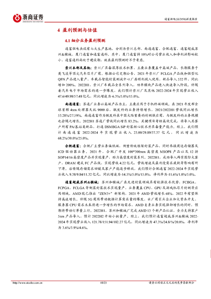 选择 A 股上市封测公司华天科技、晶方科技、甬矽电子作为可比公司,预计公 司 2022-2024 年 营 业 收 入 分 别 为 201.75/241.66/288.44 亿 元 , 同 比 增 速 为 27.6%/19.8%/19.4% ;归 母 净 利 润 为 5.91/10.25/15.72 亿 元 , 同 比 增 速 为 - 38.3%/73.5%/53.4% , 当 前 股 价 对 应 PE 为 55.2/31.8/20.7 倍 , EPS 为 0.39/0.68/1.04 元。公司深度绑定 AMD,先进封装技术优势突出,可提供晶圆级 和基板级 Chiplet 封测解决方案,受益于技术及下游需求升级驱动,后续有望充 分受益,同时相比历史估值中位数 65.1 仍有较大空间,给予“买入”评级。