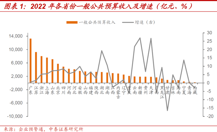 2022年,广东、江苏、浙江、上海等省份一般公共预算收入处于前列,从同比增速看,新疆、天津、云南3个省份增速较高,超过20%,而甘肃、重庆、广西、西藏、海南、江西和内蒙古7个省份增速为负。27个省份财政自给率同比有所下降,上海、吉林、浙江、海南、辽宁、江苏、福建等自给率下滑较为明显,超过6%。14个省份2023年一般公共预算收入目标增速超过2022年增速;而西藏、云南、天津、湖北等省份2023年目标增速则较大程度小于2022年增速。