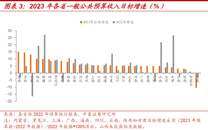 14个省份2023年一般公共预算收入目标增速超过2022年增速。海南、甘肃、重庆、广西、江西、内蒙古2022年增速为负,2023年目标增速较高;而西藏、云南、天津、湖北等省份2023年目标增速则较大程度小于2022年增速。