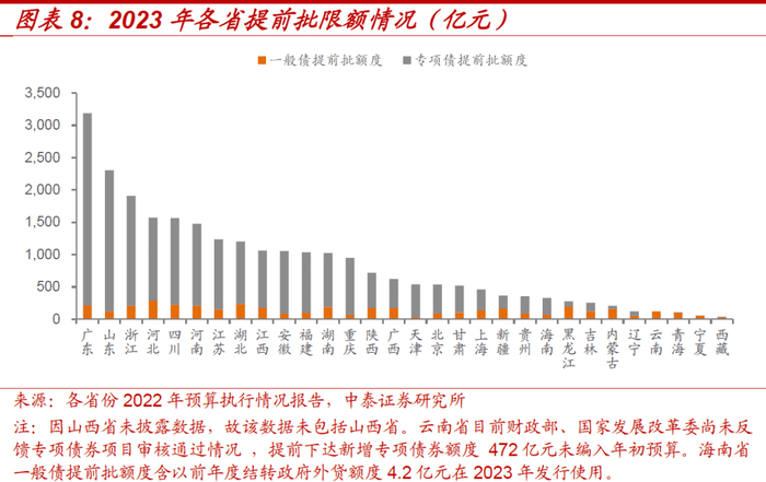 2023年,各省[2]提前批新增地方政府债务限额合计2.52万亿元。广东、山东、浙江、河北和四川等省份提前批限额超过1000亿元,而西藏、宁夏、青海2个省份的提前批限额规模较小。