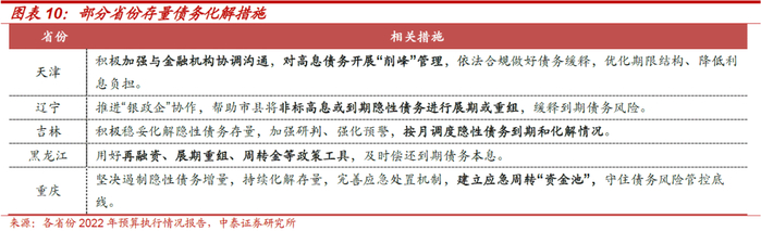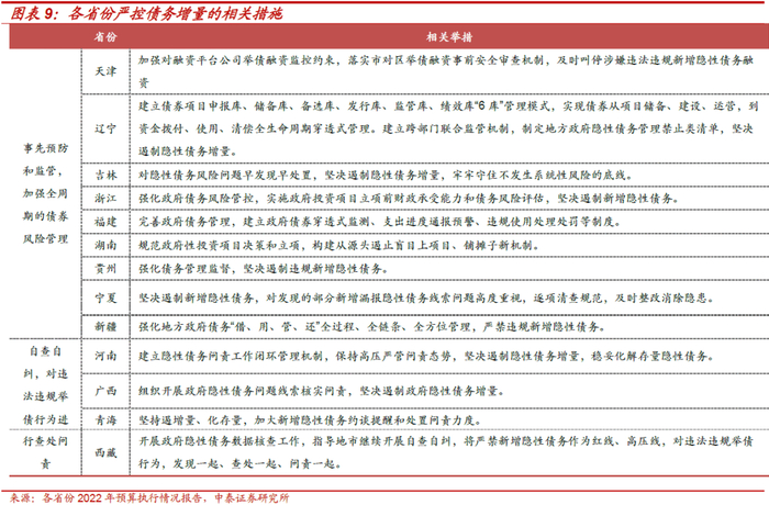 “严控增量、化解存量”仍是2022年各省份主要化债思路。严控增量主要包括两个方面:一是事先预防和监管,加强全周期的债券风险管理,及时辨别风险;二是自查自纠,对违法违规举债行为进行查处问责。存量化解包括与金融机构协调沟通、展期重组、优化期限结构、降低利息负担,建立应急周转“资金池”等,譬如天津、辽宁提及对高息债务进行重组、降低利息负担。2022年,江苏、北京、天津、河南、甘肃、青海、宁夏7个省份超额完成年度隐债化解任务,其中北京提前三个月完成全域无隐债试点任务要求,广东如期完成全域无隐性债务试点,全省存量隐性债务全部化解。