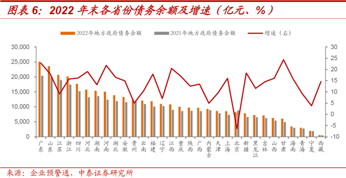 2022年末,各个省份地方政府债务余额同比均有所增长,其中甘肃、广东、河南、江西4个省份增速超20%。各省债务率同比均有不同程度上升,其中黑龙江、新疆、天津、贵州等省份债务率上升明显。2023年,除去山西外的30个省份提前批新增地方政府债务限额合计2.52万亿元。