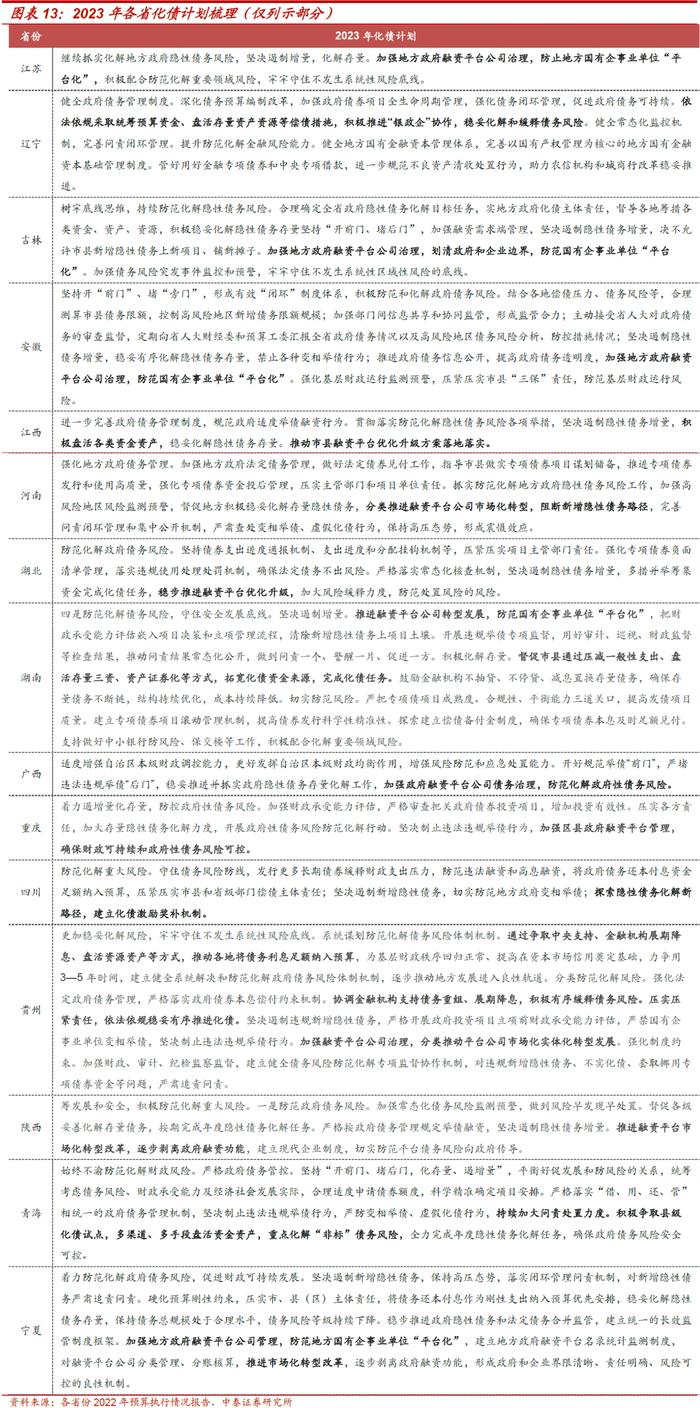 2023年,各省份化债基调仍是“遏制增量、化解存量”、“坚守不发生系统性风险底线”。此外,部分省份提及推进融资平台管理以及具体化债措施等。