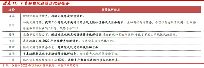 2022年,7省超额完成隐债化解任务。江苏、北京、天津、河南、甘肃、青海、宁夏7个省份超额完成年度隐债化解任务,其中北京提前三个月完成全域无隐债试点任务要求。此外,广东如期完成全域无隐性债务试点,全省存量隐性债务全部化解;内蒙古三个旗县隐债清零;四川债务率保持在“绿色”区间;青海全省和省本级政府隐性债务风险均实现下调一个等级;广西全区已累计化解2018年清查统计政府隐性债务底数50%以上。