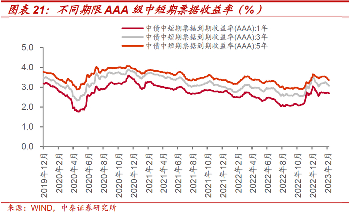 本周中短票据收益率均有所下行。具体来看,本周AAA评级1年期、3年期、5年期中短票据分别收于2.70%、3.07 %、3.35%,较上周分别下行3.27bp、7.00bp和7.40bp。