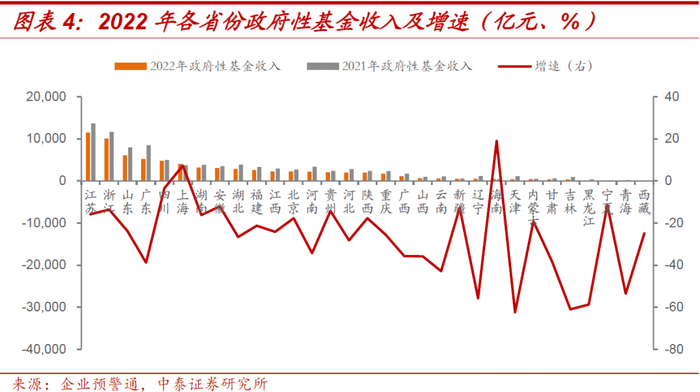 2022年,地产下行,土地出让低迷,仅海南和上海政府性基金收入实现增长。海南和上海政府性基金收入同比分别增长18.97%和7.23%;天津、吉林、黑龙江、辽宁和青海等省份下滑明显,同比下滑超50%。