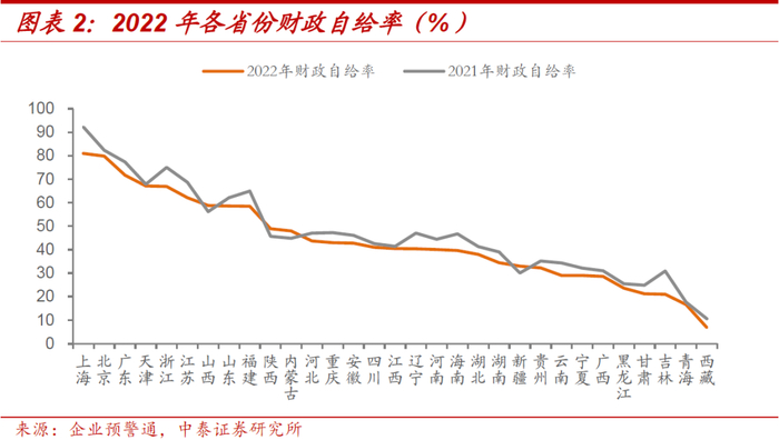 2022年,27个省份财政自给率同比有所下降。上海、北京、广东、天津、浙江、江苏等省份财政自给率较高,超过60%,而西藏、青海、吉林、甘肃、黑龙江等省份财政自给率仍偏低。对比2021年,上海、吉林、浙江、海南、辽宁、江苏、福建等自给率下滑较为明显,超过6%。