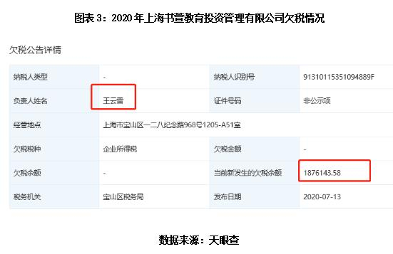 同日,优蓝国际的子公司上海书萱教育投资管理有限公司(下称“上海书萱”)因拖欠企业所得税187.61万元被上海市宝山区税务局列入欠税公告名单,彼时上海书萱的负责人是王云雷,即优蓝国际的控股股东、董事会主席兼首席执行官。