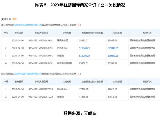 再往前追溯,同年4月30日,优蓝国际的两家全资子公司安徽优尔蓝信息科技有限公司和安徽省优蓝环境资源有限公司因拖欠增值税、城市维护建设税等税款被国家税务总局临泉县税务局列入欠税公告名单,最高一笔欠税金额达51.9万元。