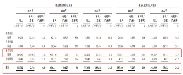 雇员管理服务业务毛利率在其全部业务中最低,2019年至2021年及2022年上半年分别为-3.3%、0.4%、8.3%及12.7%。其中2019年,该项核心业务的成本甚至高于收入。
