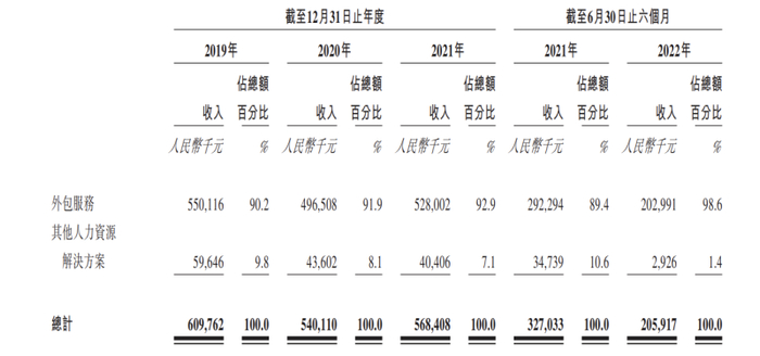 优蓝国际在招股书中的介绍,其所谓的雇员管理服务主要收入来源来自于外包服务。招股书显示,2019、2020、2021年度及2022年上半年,优蓝国际外包服务收入分别为5.5亿元、4.97亿元、5.28亿元及2.03亿元,占总收入的比例达到82.7%、78.1%、71.5%及66.79%。均贡献了总收入近七成。