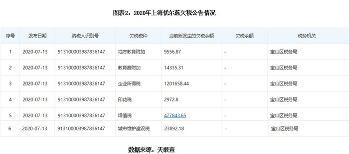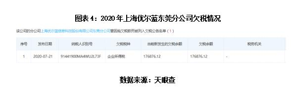 然而,天眼查显示,2020年7月13日,上海优尔蓝因拖欠企业所得税、印花税、增值税、地方教育附加税、教育费附加、城市维护建设税等多项税费被上海市宝山区税务局列入欠税公告名单,欠税金额合计173.03万元,其中欠税金额最高的一笔是企业所得税120.17万元。