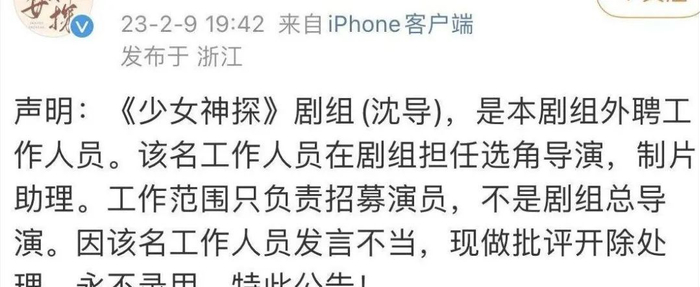 说这个导演只是外聘员工,不是剧组总导演,已被开除,永不录用。