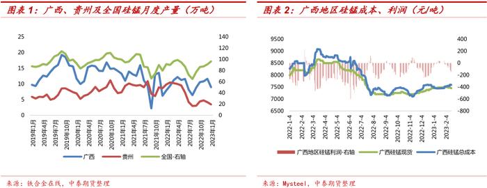 为深入了解广西、贵州两地产量下行的真实原因,调研广西地区最新的生产情况、成本利润情况,以及对主要原料锰矿的后市预期,我们于2月13日-2月17日在广西南宁、百色、全州、钦州等地开展了为期5天的调研:调研硅锰厂5家,月度硅锰合金产量约4-5万吨(广西地区厂区产量约3.5-4.5万吨),在广西总产量中占比约50-55%;调研锰矿贸易商2家,2022年度锰矿贸易量合计70-80万吨。