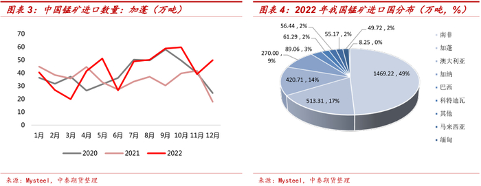 调研背景:加蓬是我国锰矿除南非外的第二大进口国,2022年1-12月我国从加蓬进口锰矿共513万吨,占比我国总进口量的17.15%。加蓬锰矿储量6100万吨,占全球已探明储量的4%。其中最大锰矿山是莫安达锰矿(Moanda),于上世纪60年代进行开采,主要是氧化锰矿,该锰矿区的矿床具有规模大和埋藏浅的特点,锰氧化物含量高,锰矿品位高达48%,部分品位能达到50%-52%,矿体平均厚度5km,可露天开采,由埃赫曼·康密劳开发。目前加蓬内陆主要的锰矿运输主要有铁路和公路,有一条横贯加蓬东西的铁路干线,自港区直达东南部的弗朗斯维尔(Franceville),莫安达矿区也可由此线直达港区。2月24日凌晨,当地暴雨引发的山体滑坡将部分铁路路段冲毁,自此中断了一个半月左右的加蓬锰矿运输。