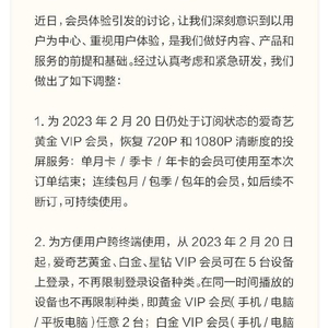 1.为2023年2月20日仍处于订阅状态的爱奇艺黄金VIP会员,恢复720P和1080P清晰度的投屏服务:单月卡/季卡/年卡的会员可使用至本次订单结束;连续包月/包季/包年的会员,如后续不断订,可持续使用。