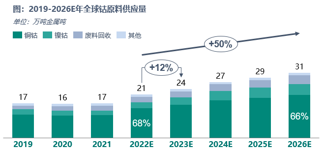 2022年全球经济下行,手机出货量创近年来新低,高镍三元成为趋势,钴市场需求减少,钴系产品价格大幅下行。供应端,2022年钴原料产能增量较大,全球钴供应21万金属吨,同比去年16.72万吨增加25.59%。