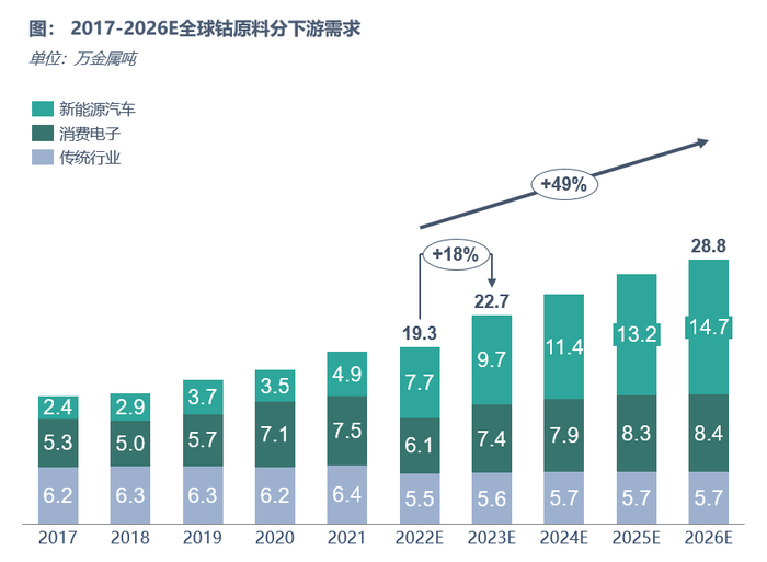 全球对钴的需求主要来自于数码、动力、储能等锂电池应用领域,及传统行业如:高温合金、硬质合金、催化剂、陶瓷颜料、磁性材料、有机材料等行业。随着智能手机普及,数码电池、磁性材料对钴需求增加。传统行业的钴需求占比同步下滑。但智能手机逐步进入存量市场,数码3C消费需求增速降低。近年来新能源汽车发展迅速,对钴需求进入爆发期。