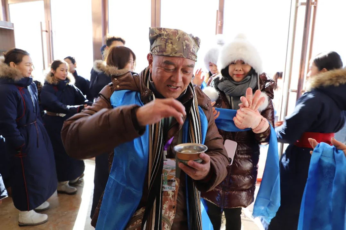 雪后的草原白雪皑皑,在希拉穆仁草原神鹰宏浩接待点,热情好客的草原儿女用蒙古族最高礼遇接待来自大海之滨的客人。雄壮威武的欢迎马队,热情浓郁的下马酒,纯洁神圣的蓝色哈达;来自达茂旗乌兰牧骑的姑娘小伙们载歌载舞,表达着对远道而来客人的友好与欢迎。来自澳门的陈先生说:“我是第一次来到内蒙古大草原,在这里我感受到了蒙古族的热情,他们的马队让我感受到了策马奔腾的快感,民族服饰给我一种大气磅礴的感觉。”
