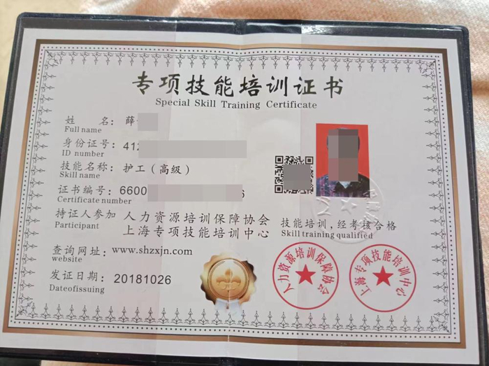 河南来沪务工的薛女士日前向12345市民服务热线反映,称她去年10月份来沪求职时,闵行区浦星公路1969号红星国际广场内的一家中介提出来的,是一张“专项技能培训证书”。她出示了这份证书,上面的颁发单位是“人力资源培训保障协会”,技能名称是“高级护工”。证书上印有二维码,扫描后指向地址为“http://www.shzxjn.com”的网站,并展现了该证书的电子版。当时,薛女士为获取此证支付了980元,她回忆,“一天都没有培训,中介直接就帮忙办出了这张证,而且发证日期还写着2018年。”春节后,她拿着这张证返沪求职,岂料不少中介却直言这张证是张“假证”,拒绝为她安排工作。她由此向“12345”投诉,希望维护自己的权益。