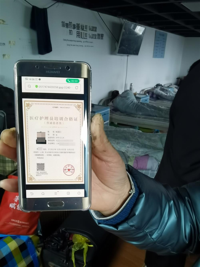 △劳务中介声称“医疗护理员培训合格证”是找工作必备。图为一人向记者展示了她手机里存有的该证照片。