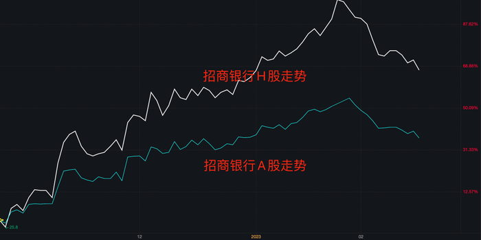 其实,2022年11月以来招商银行的股价反弹,国内机构一直是卖出方。我们看这几个月招行H股走势和招行A股走势对比,就能看出反弹阶段招行A股一直大幅弱于H股。