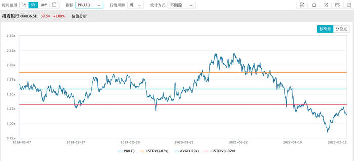 招商银行市净率估值中枢为1.3倍到1.8倍。2022年,由于几次事件冲击和整体市场熊市,招行估值打破历史区间,下行到最低0.85倍市净率。