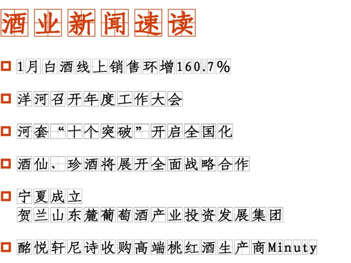 1月白酒线上销售环增160.7%/河套“十个突破”开启全国化/贺兰山东麓葡萄酒产业投资发展集团成立······