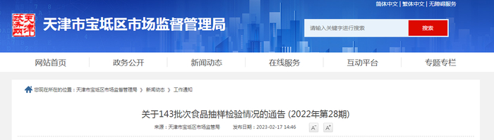 天津市宝坻区市场监督管理局抽检143批次食品 不合格样品8批次