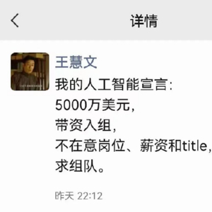 几天后,原美团联合创始人王慧文在朋友圈发文:5000万美元,带资进组,不在意岗位、薪资和title,求组队。言外之意,正是要在AI赛道上先站位、再组队,尴尬的是谁,周鸿祎没说。
