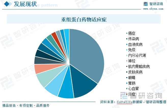 根据Cortellis数据显示,目前重组蛋白药物适应症涉及最多的包括癌症、传染病、血液疾病、免疫、内分泌代谢、神经系统等疾病。