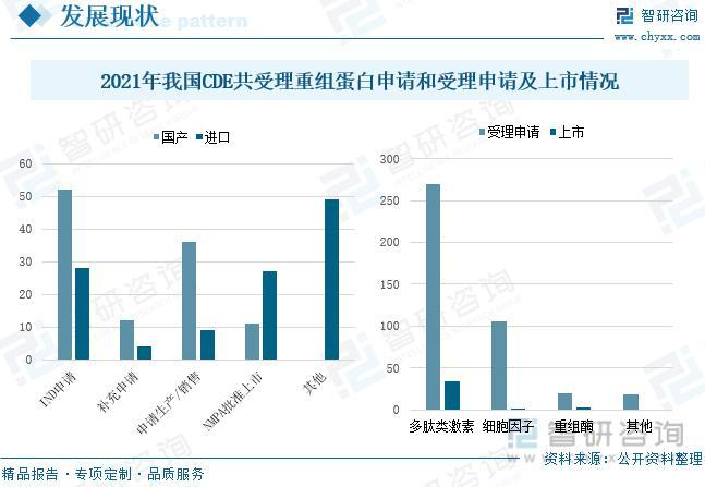 2021年我国CDE共受理重组蛋白申请414件,国产231件、进口183件,其中包括IND申请80件、补充申请16件、仿制药补充申请224件、申请生产销售45件及其他申请49件。从产品受理申请和上市情况来看,2021年CDE受理多肽类激素270个、细胞因子106个、重组酶20个及其他18个申请。