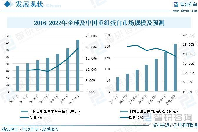 重组蛋白运用领域众多,加之生物制药行业的蓬勃发展发展,重组蛋白的市场规模不断扩大,预计到2022年全球重组蛋白市场规模增长至148亿美元,预计2022年中国重组蛋白的市场规模增长至209亿元。国家对于重组蛋白行业出台了各种规章政策和引导性文件,2022年6月国家药监局发布《2021年度药品审评报告》,提出持续跟进各技术路线新冠病毒疫苗研发进展,尤其是重点跟进重组蛋白类临床试验进展情况。力求加快培育出一批具有较强国际竞争力的新兴产业,国家对于生命健康、生物制造、生物医药的大力支持,带动了国内相关产业的发展,新冠疫情的影响下,各种原材料进口受阻,内生需求扩大,进一步促进本土企业的发展,随着国家相关政策的出台、研发投入的增加、产品质量的提高、业务水平的进步等,国内重组蛋白行业将通过价格、供应链以及服务优势提升市场竞争力,逐渐打破进口产品为主导的局面,加快形成进口替代趋势发展。