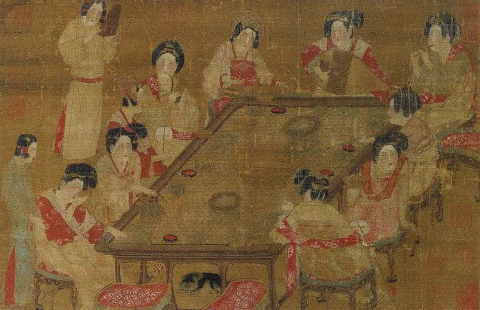 画中反映了唐代宫廷仕女品茶、饮酒的雅集场面,仕女所持为越窑青瓷茶具