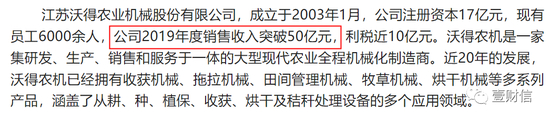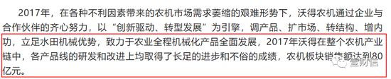 沃得农机公众号发布于2018年1月的宣传稿显示,2017年,沃得农机在农机板块销售额达到80亿元;2020年7月的宣传稿件显示,沃得农机2019年销售收入突破50亿元;2020年9月宣传稿显示,沃得农机隶属于江苏沃得集团,是一家大型现代的农业全程机械化制造商,年营业额超90亿元。