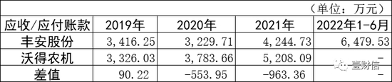 在丰安股份对沃得农机应收账款的合并范围中包括沃得农机关联方的前提下,其对该客户2020年、2021年的应收账款额却低于同期沃得农机对丰安股份的应付账款额,二者差额分别为553.95万元、963.36万元,这令人不解。