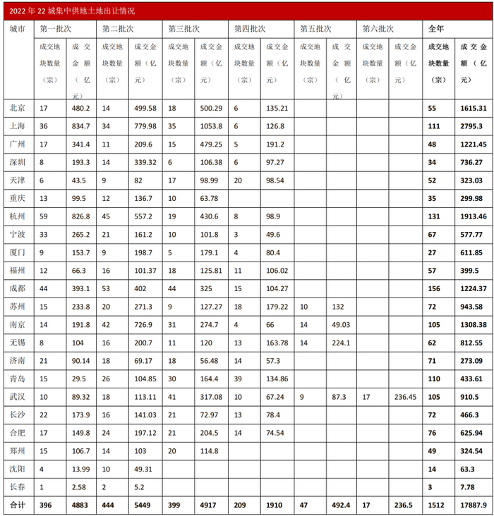 整体上看,2022年我国土拍市场一直不温不火,我国土储收入规模同比减少约2层,成交地块平均溢价率相比前两年大幅回落。据中房网统计数据显示,2022年全国土地成交价款17887.9亿元,2021年全国土地成交价款20263.25亿元,同比下降11.72%。年内全国土地成交面积8455万平方米,去年同期数据为18287.48万平方米,同比下降53.77%。其中,北京、上海、广州、杭州、成都、南京6城全年卖地收入超千亿元,而上海更是以2795.3亿元的土地成交金额居于各城之首,其次是杭州,全年卖地收入也超过了1900亿元。