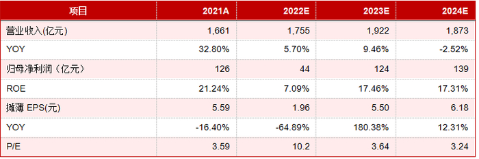 预计新城控股2022-2024年每股收益(EPS)分别为1.96元、5.5元、6.18元。绝对估值模型下,对应每股合理内在价值为34.22元。相对估值模型下:目前行业2023年PE均值为14.56倍;考虑公司的规模和未来业绩增长情况,给予公司2023年6-8倍PE,对应每股合理估值区间在33-44元之间。