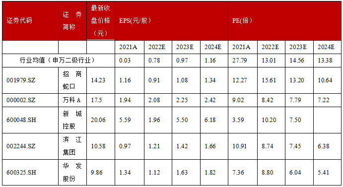 我们预计公司2023年的PE值为7.5,2022-2024年EPS分别为每股1.96、5.5、6.18元,对应2023年PEG为0.61。从绝对数上看,公司2023年PEG 小于1,公司股价存在明显的低估;从参考可比公司来看,招商蛇口2023预测PEG为0.55、万科A2023预测PEG为1.03、滨江集团2023预测PEG为0.44、华发股份2023预测PEG为0.52。公司PEG跟可比公司相比处在较低水平。