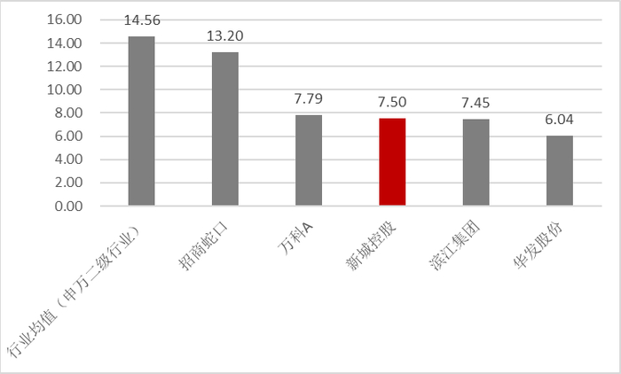 对比申万二级房地产行业均值,以及房地产行业相关可比公司,同时综合考虑公司规模、主营业务范围、公司性质等因素,选取招商蛇口、万科A、滨江集团及华发股份作为可比公司。申万二级行业房地产开发板块2023年东财Choice一致预期估值平均值为14.56倍,高于公司估值水平。考虑到新城控股在房地产开发行业的品牌优势及财务稳健情况,给予公司2023年PE估值6-8倍,对应目标价33-44元,对应2023年2月13日收盘价格20.00元/股,股价65%-120%的上涨空间。