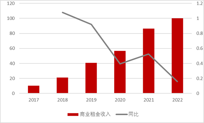 公司在2017到2022 年期间,商业运营收入大幅提升,由10.2亿元增长至100.06亿元,年化复合增长率57.88%。2022年公司实现商业运营总收入100.06 亿元,同比增长15.82%。