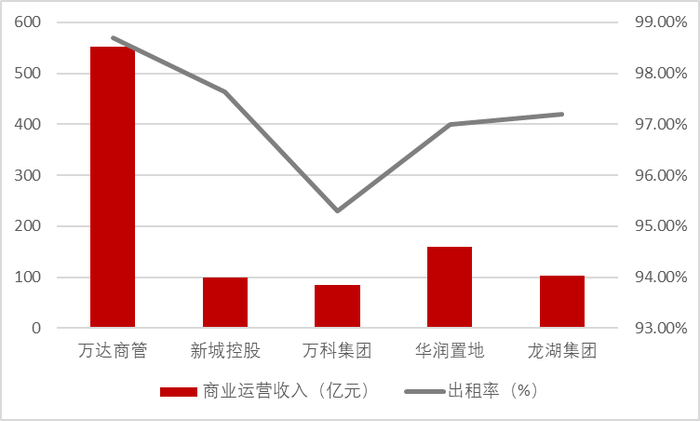 我们选取了万达商管、万科集团、华润置地和龙湖集团四家涉足商业地产的企业与公司进行比较,发现公司商业出租率排名行业第二为97.63%仅比第一名万达商管低1.07pct。然而公司2022年商业运营收入为100.06亿元在可比公司中排名第四。