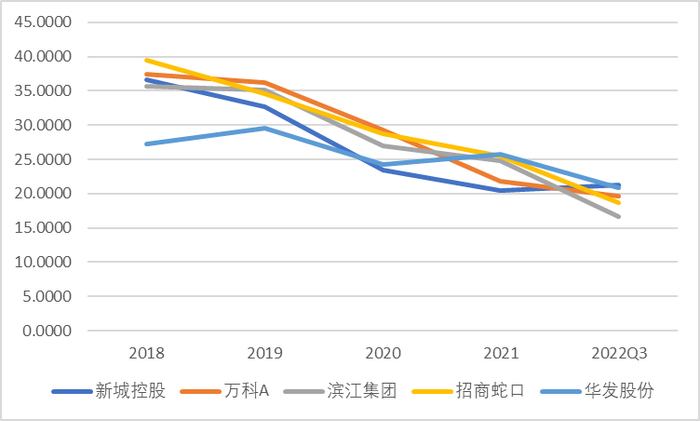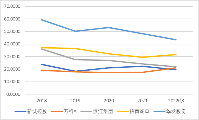 我们选取了万科A、滨江集团、招商蛇口和华发股份四家A股上市房企与公司进行比较,发现近五年房地产行业各上市公司销售毛利率整体呈下滑趋势。截至截至2022年第三季度公司销售毛利率处于行业内领先水平截至,新城控股销售毛利率为21.29%,相较于2021年销售毛利率20.45%小幅上升0.84pct,比可比公司第二名华发股份2022Q3销售毛利率20.87%高出0.42pct。这说明公司的精细化建造管理水平处于行业领先水平。