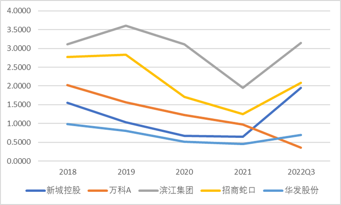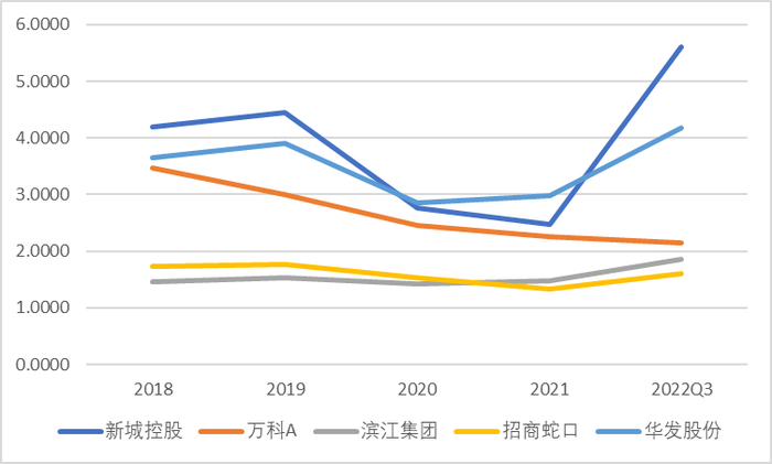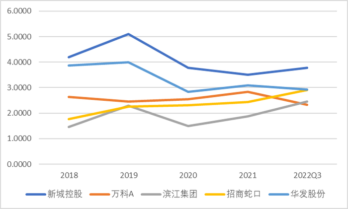 对比可比公司管理效率。从销售费用率来看,可比公司近2年销售费用率都有所提升,这主要是因为近2年房地产行业市场整体较冷,各房企为了促销加快资金回笼都使用了一系列的促销手段。其中新城控股销售费用率远高于行业领先水平,新城控股、万科A、滨江集团、招商蛇口、华发股份2022Q3销售费用率依次为3.78%、2.32%、2.45%、2.90%、2.94%;从管理费用率来看,新城控股和华发股份近两年管理费用率上升明显,其他三家公司基本维持稳定,上述公司2022Q3管理费用率依次为5.62%、2.14%、1.85%、1.6%、4.18%;从财务费用率来看,可比公司近5年财务费用率都是先降后升,主要是由于这两年国家对房地产的金融监管政策收紧,加剧了房地产企业的财务成本。新城控股财务费用率在可比公司中处于较低水平,上述公司2022Q3财务费用率依次为1.96%、0.36%、3.14%、2.09%、0.7%。