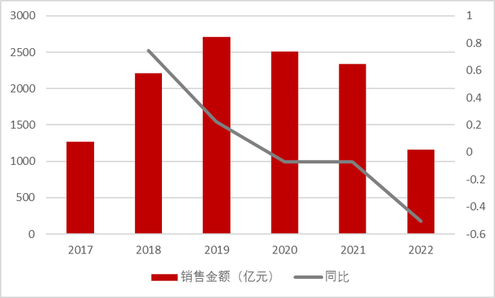 自1998年我国全面停止住房实物分配制度,建立了住房分配货币化制度。在接下来的20年间,我国房地产行业受益于人口红利及城镇化进程的推进得到高速发展。全国商品房销售面积从1998年的12185.3万平方米达到峰值2021年的179433.41万平方米,随后2022年大幅回撤至135837万平方米,基本回落至全国棚户改政策出台之前的水平。由此可见我国房地产行业规模已经见顶了。2022年,全年商品房销售面积135837万平方米,同比下滑24.3%;商品房销售金额133308亿元,同比减少26.73%。
