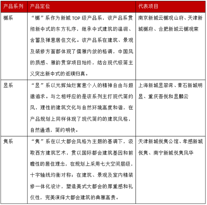 公司的住宅产品按照风格与目标客户两个维度划分,风格维度上包括“新中式”——樾系、“大都会”——隽系、“现代”——昱系三大产品系列,客群目标维度上包括基于年轻时尚人群需求尚人群需求的“乐居”、家庭品质升级需求的“圆梦”、颐养享受需求的“尊享”三大产品线。各维度的组合形成九大产品系列以满足不同经济能力与购房需求的客户对不同风格的偏好,做到客户类型上的全面覆盖。
