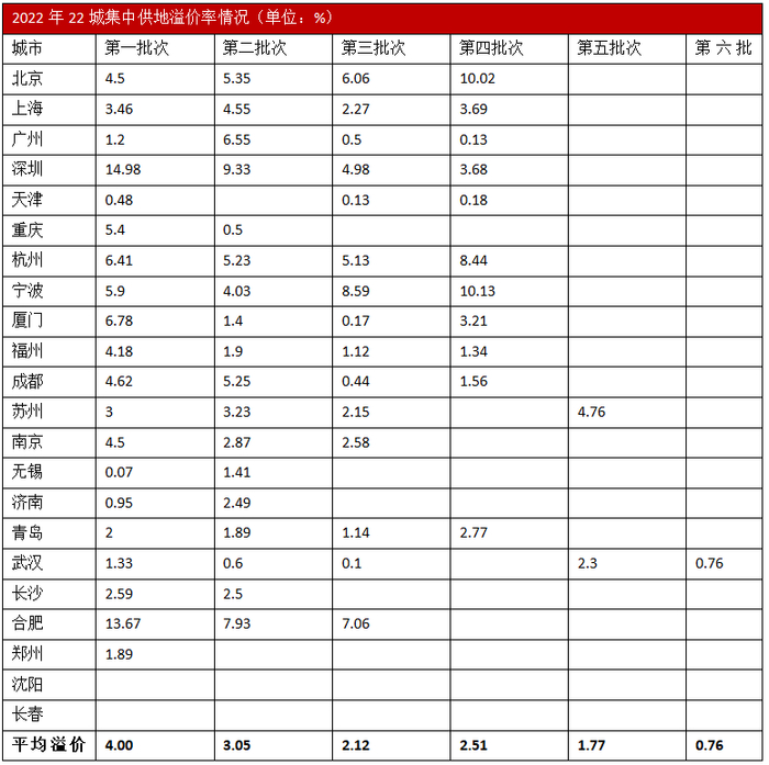 从全年集中供地批次情况来看,土地市场的供给节奏也有了一定的变化,除长春、沈阳外,2022年内20城集中供地次数超过3次,突破政策上限。全年各批次整体成交溢价呈现下滑趋势,从第一批次的平均溢价率4%到第六批次的平均溢价率0.76%。与此同时,城市之间集中供地热度分化也较为明显。纵观全年,北京、上海、深圳、杭州、宁波和合肥,为集中供地热度较高的城市,这些城市前四批次集中供地溢价率大多保持在3.5%以上,尤其是在首批集中供地中,深圳和合肥的土拍溢价率均超过10%;北京集中供地热度呈现渐次回暖,在第四批次的集中供地中溢价率回归到10%的水平;同时,宁波也在第四批次中恢复到10%以上。反观郑州、长春、沈阳、天津、无锡等城,土拍热度则明显遇冷,集中土拍多数以零溢价收官。其中,长春全年集中供地仅成交3宗地块,是22城中成交地块数量最少的城市,其次是沈阳,全年成交14宗地块,且均为底价成交,集中供地热度已降至冰点。